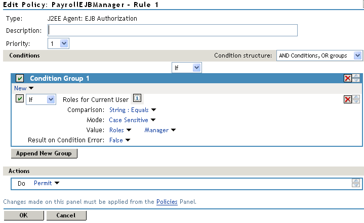 For the first rule, click , set up a condition that permits access if the user has been assigned the Manager role, then click . Your rule should look similar to the following: