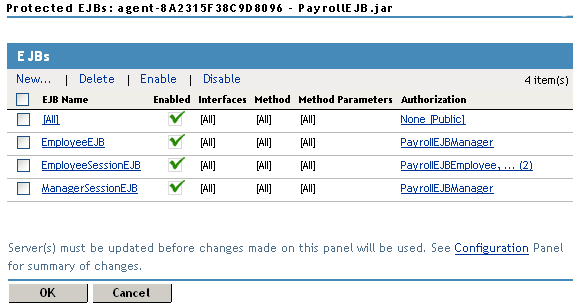 To allow the J2EE Agent to enforce authorization for the payroll EJB module, you need to create policies for four EJBs.