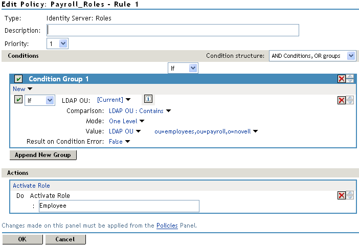 The following rule uses the LDAP OU condition to determine whether the user is an employee. It assumes that all employees are in the ou=employees,ou=payroll,o=novell container.