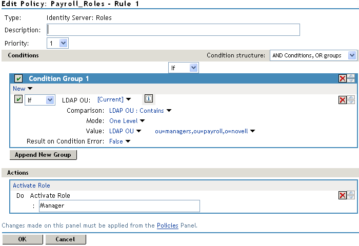 The following rule uses the LDAP OU condition to determine whether the user is a manager. It assumes that all managers are in the ou=managers,ou=payroll,o=novell container.