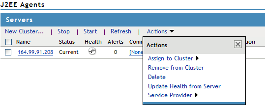Removing a J2EE Agent from a configuration disassociates the J2EE Agent from the cluster configuration. The configuration, remains unchanged and can be reassigned later or assigned to another cluster. server. You can either remove one member from a cluster or remove all of them at once.