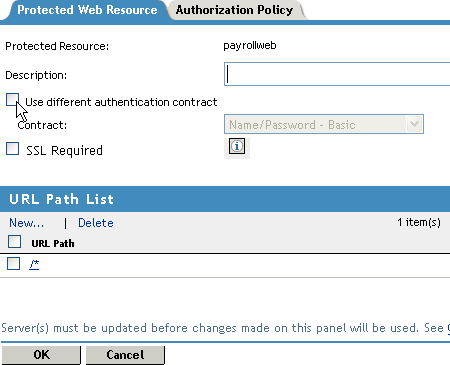 To use this protected resource to protect a single page, specify the path and the filename. For example, to protect the login.html page in the /login directory, specify the following