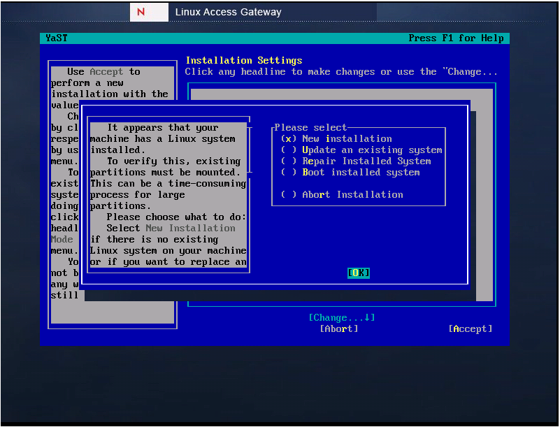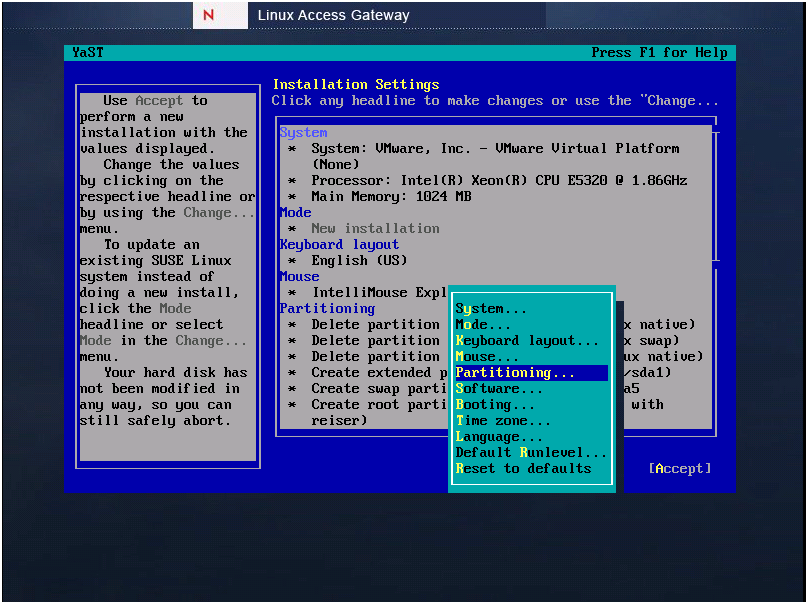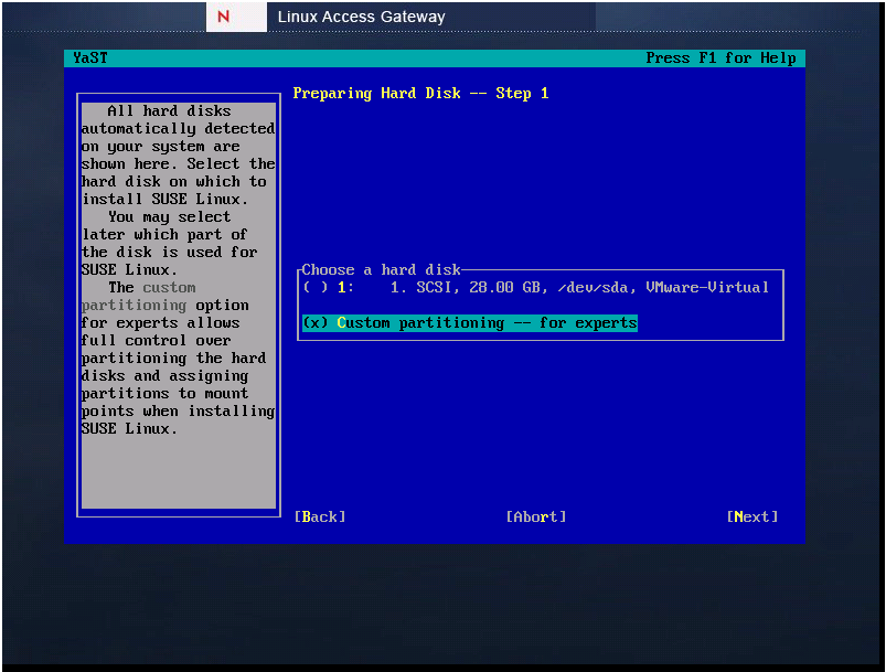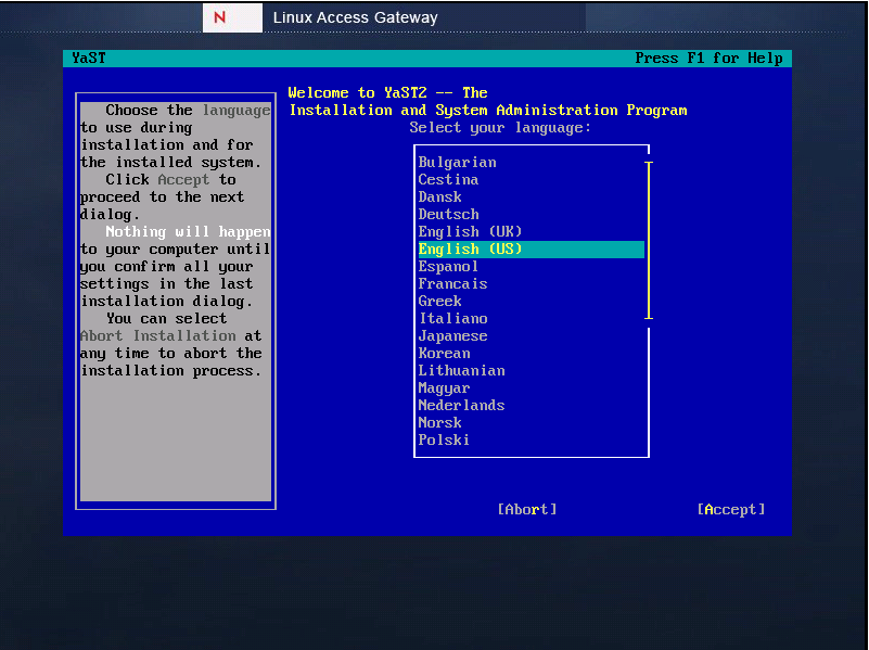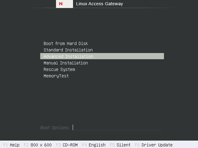 Restart the system. Insert the Linux Access Gateway installation CD.