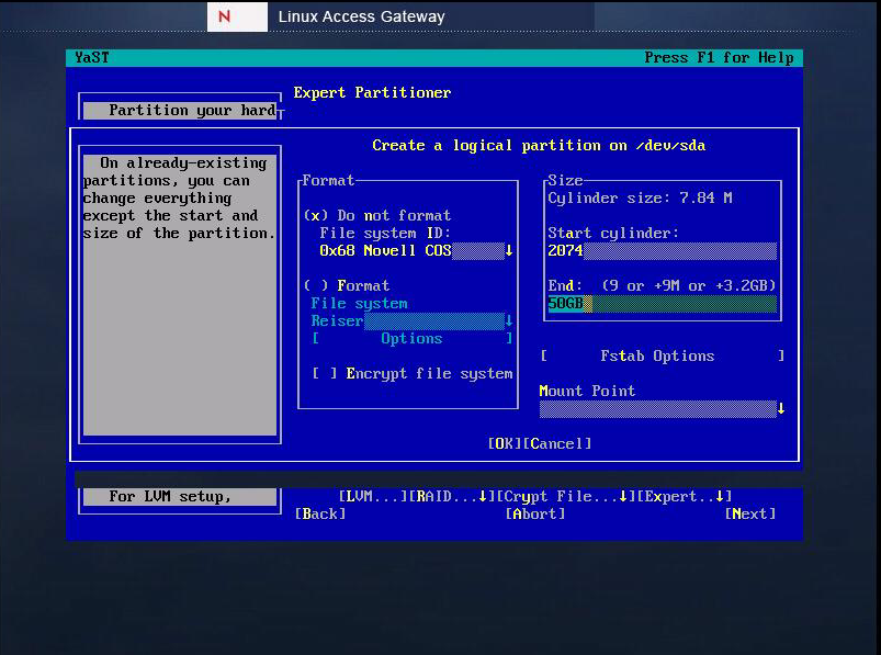 Size: Accept the default value for the cylinder value. This selection allocates the remaining space (50 GB) to the