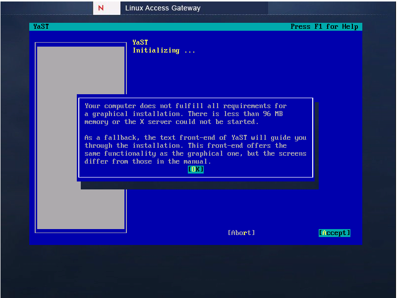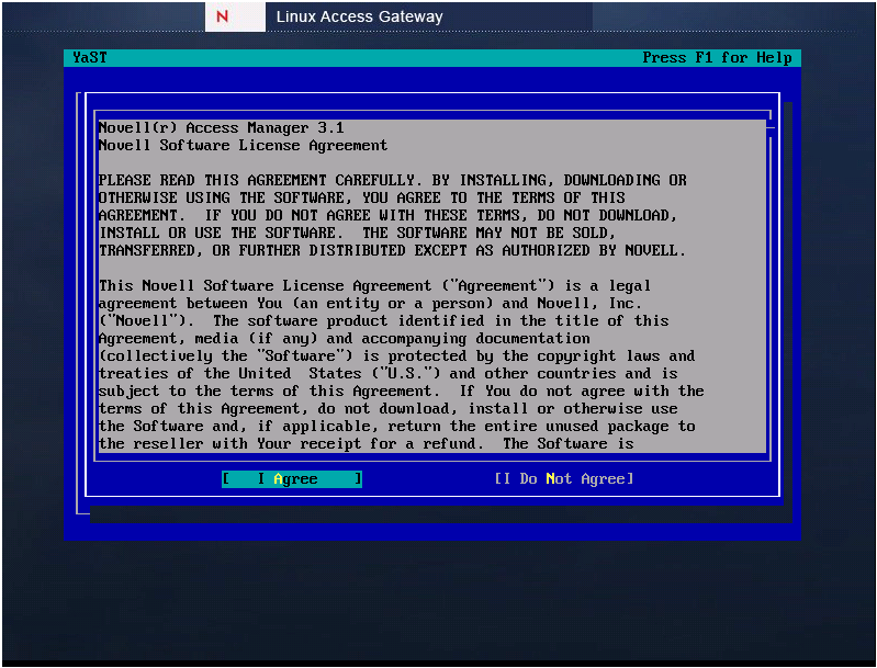 The Linux kernel loads, and the advanced installation starts and displays the Linux Access Gateway splash screen followed by the License Agreement screen.