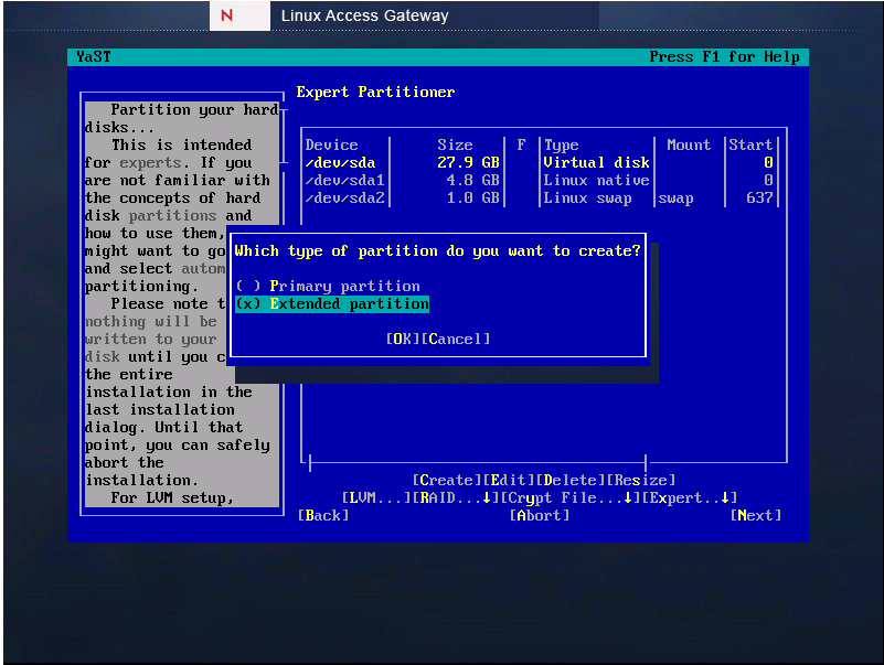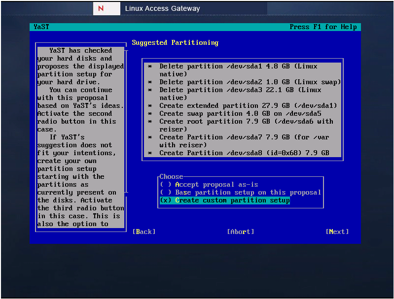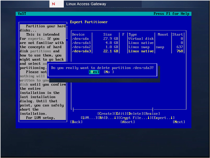 To get free space to install Linux Access Gateway, select an existing partition in RHEL for removal. If you already have free space, go to Step 12.