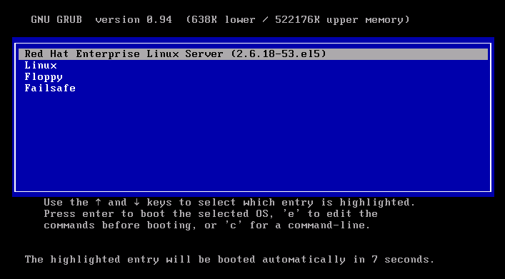 title Red Hat Enterprise Linux Server (2.6.18-53.el5) root (hd0,0) kernel /boot/vmlinuz-2.6.18-53.el5 ro root=LABEL=/ rhgb quiet initrd /boot/initrd-2.6.18-53.el5.img
