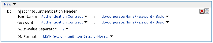 To inject values into the authentication header, you need to know what the Web server requires. For basic authentication, you need to inject the user name and password. For a sample policy for a Web server that requires the LDAP username and password to be injected into the header, see Setting Up an Identity Injection Policy