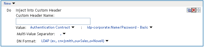 Credential Profile: Injects the credentials that the user specified at login. You can select , , or . For more information, see Section 4.3, Configuring an Authentication Header Policy.