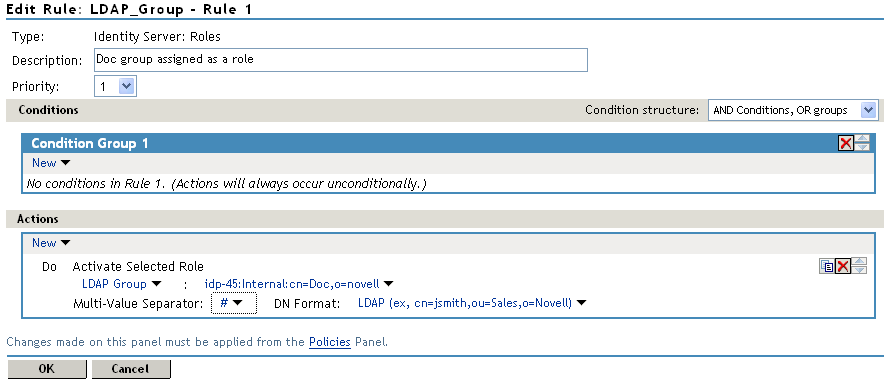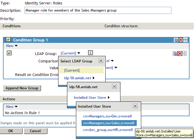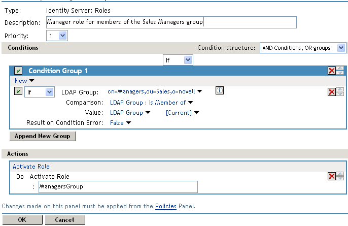 Result on Condition Error: This sets up the results that are returned if an error occurs while evaluating the condition (for example, the LDAP server goes down). This rule is set up to grant the user the role of ManagersGroup if the condition evaluates to . If an error occurs, you do not want random users assigned the role of ManagersGroup. Therefore, for this rule, you need to select .
