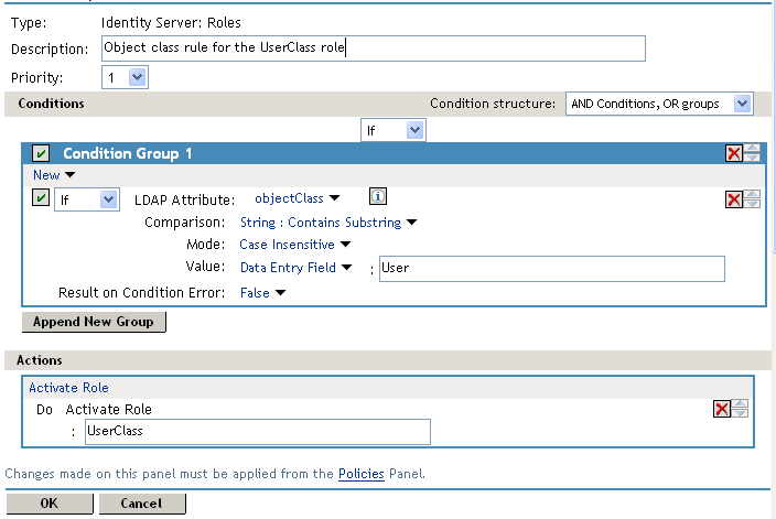 Result on Condition Error: This sets up the results that are returned if an error occurs while evaluating the condition (for example, the LDAP server goes down). This rule is set up to grant the user the role of UserClass if the condition evaluates to . If an error occurs, you do not want random users assigned the role of UserClass. Therefore, for this rule, you need to select .