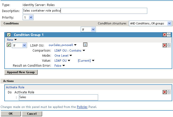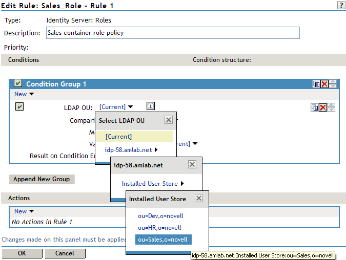 Result on Condition Error: This sets up the results that are returned if an error occurs while evaluating the condition (for example, the LDAP server goes down). This rule is set up to grant the user the role of Sales if the condition evaluates to . If an error occurs, you do not want random users assigned the role of Sales. Therefore, for this rule, you need to select .