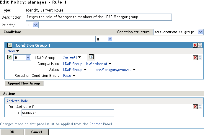 Roles are assigned at authentication, so this type of trace is found in the catalina.out file (Linux) or the stdout.log file (Windows) of the Identity Server. This is a trace of a user who does not match the requirements to be assigned the Manager Role (for a definition of this Role policy, see Figure 6-1).