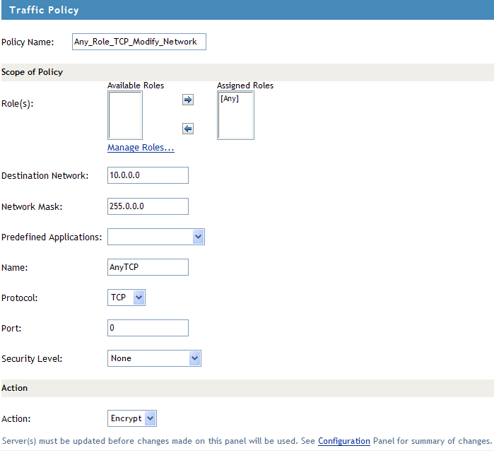 Security Level: Specify the minimum level of security to be adhered to by the client machine in order to apply this traffic policy. For more information on how to configure security levels, see Section 14.2, Configuring Client Security Levels.
