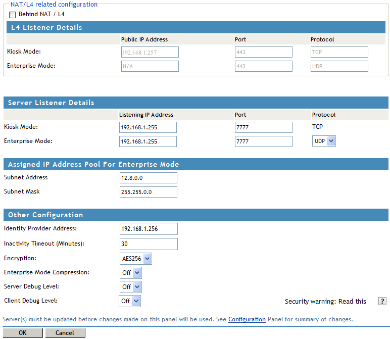 Protocol: Specify a protocol for Kiosk mode as well as for Enterprise mode, when the SSL VPN server is behind an L4 or a NAT. The protocol is TCP for Kiosk mode, but it can either be TCP or UDP for Enterprise mode.