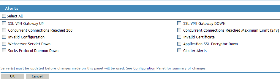 Sends an alert when the SSL VPN server is down and is not functional. |