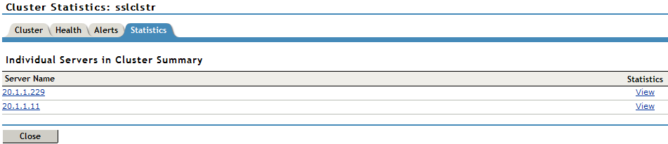Statistics: Click the link to get a summary of the statistics of individual servers in a cluster. For more information on viewing the statistics details of individual servers, see Section 26.1, Viewing Statistics of SSL VPN Server.