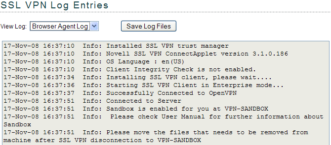 The logs indicate that the Sandbox folder is created on your desktop. For more information on how to view SSL VPN logs, see Section 6.3, Viewing SSL VPN Logs.