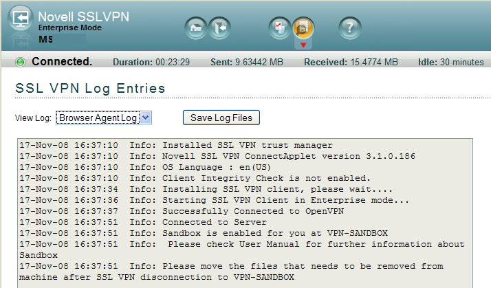 NOTE:When you click the installation logs, you might notice the log message Sandbox is enabled for you at VPN-SANDBOX. This message indicates that a folder named VPN-SANDBOX was automatically created for you on your desktop during the SSL VPN connection. Copy or download all the files into this folder. This folder, along with its contents, is deleted automatically, when you disconnect the SSL VPN connection. Section 5.7, Using the Sandbox Feature