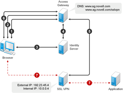 The following figure shows the Novell Access Manager components and the process involved in establishing a secure connection between a client machine and traditional Novell SSL VPN server. In this type of deployment, the Linux Access Gateway accelerates and protects the SSL VPN server.