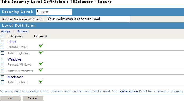 Secure: Specifies the software categories that must be present on a client machine for the client to be secure. When a client is at a secure, the traffic policies can be configured so that the client has access to all or most of the protected resources, depending on the role of the client.