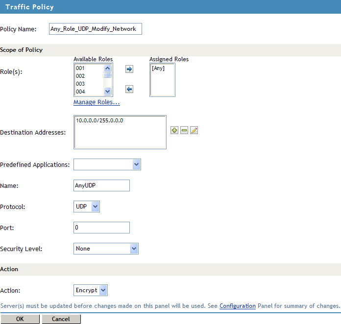 Security Level: Specify the minimum level of security to be adhered to by the client machine in order to apply this traffic policy. For more information on how to configure security levels, see Section 4.2, Configuring Client Security Levels.