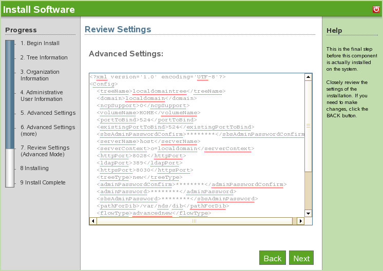 Review the settings. To make changes, you can edit the XMPL text directly to specify additional advanced settings as needed. To proceed with the installation, click .