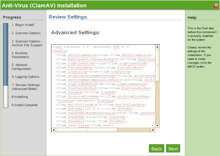 The ClamAV advanced install is now complete. Click to return to the available components page.