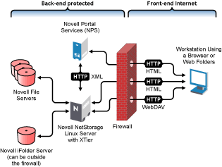 The Middle Tier server communicates with the Novell file servers in the network and provides secure authentication using eDirectory and the users' usernames and passwords.