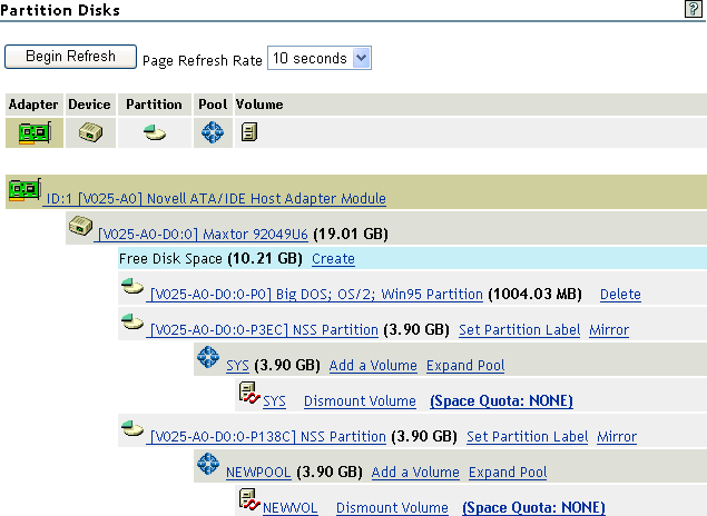 On the Partition Disks page, you can access links to delete an NSS pool or any type of volume.