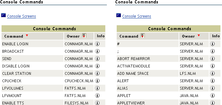 Viewing a list of server console commands is easier through Novell Remote Manager than typing the help command at the System Console prompt. You can also do several things from this view that are not physically possible at the server console. You can sort the list by the command name or by the module that registered it. Using the normal print or copy and paste features of your browser, you can also print a copy of this page to use a reference at the server console or save copy of this list to a text file and annotate the list with information that you want.