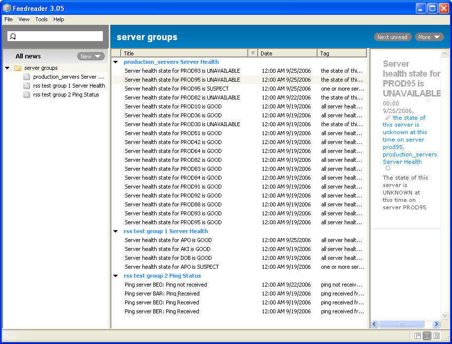 Figure 12-1 Overall Health Status for Three Server Groups in an RSS Reader Utility
