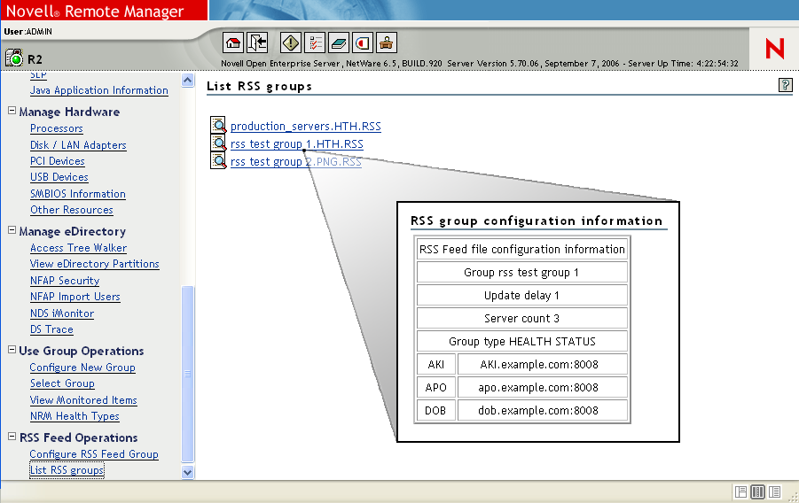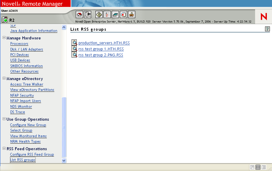 To get a list of RSS Groups you have created, click in the navigation frame. The List RSS Group page is displayed.