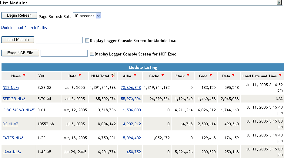 The column totals of this list show how much memory is being used by all of the NLM programs collectively on the system. This information can help you better plan for future memory upgrades to the server.