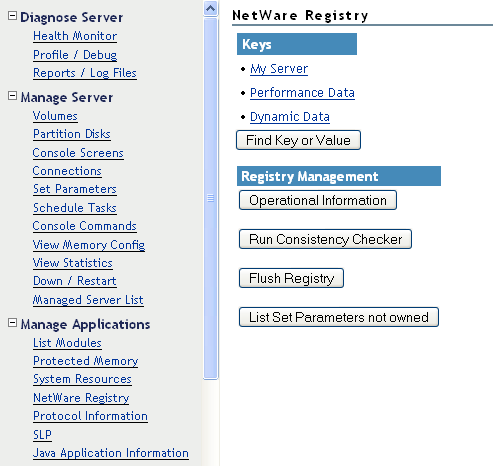 The NetWare registry is a database of setup and configuration information that determines how the NetWare server and applications on this server will run. The following figure shows an example NetWare Registry page.