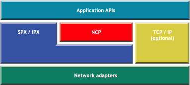 These systems have the IPX stack loaded and may also have the TCP/IP stack loaded. Systems installed with IPX only are configured to establish only NCP connections over the IPX stack. Figure 2-4 shows the relationship between the protocol stacks when a system is installed with IPX alone.