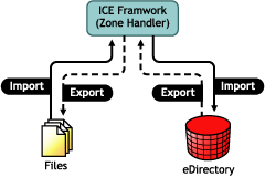 A zone source handler that forms the data to be imported and the LDAP destination handler that does the eDirectory update operation are used to import a zone. A zone destination handler that reads the required data from eDirectory and the zone source handler that formats the data and writes into the files are used to export a zone.