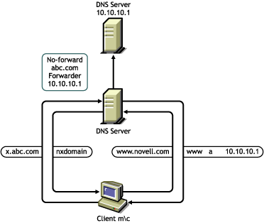 A Novell DNS server can act as a cache or forwarder. Forwarding can be configured both at server and zone level. A forwarder specifies how the behavior of queries is controlled for which the server is not authoritative and the answers do not exist in the cache