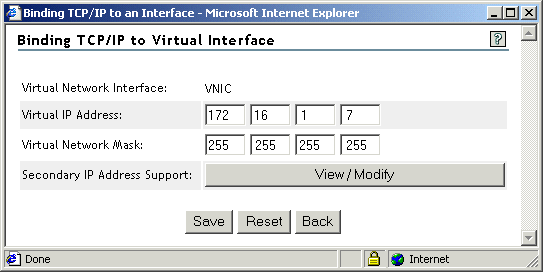 In the Binding TCP/IP to Virtual Interface window, type a virtual IP address and a virtual subnet mask.