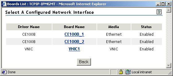 In the Select a Configured Network Interface window, click the VNIC board_name entry under Board Name.
