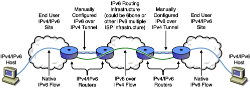 Nodes that are connected to IPv4 routing infrastructures can use a configured tunnel to reach an IPv6 backbone. If the IPv4 address of the IPv6/IPv4 border router is known, a tunnel can be configured to that router.