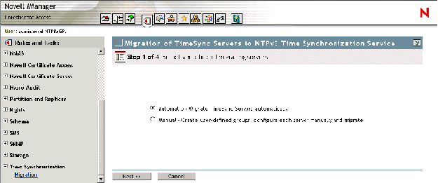 This is the default migration method and it can be used by a user who is new to NTP and prefers time synchronization services to be automatically set up in the eDirectory tree. The servers are migrated to NTPv3 based on a one-to-one mapping of timesync.cfg to ntp.conf.