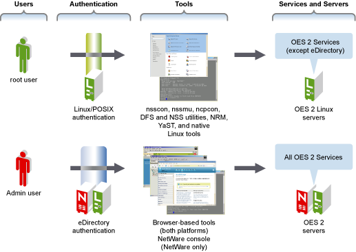 As shown in Figure 11-1, Open Enterprise Server provides a rich set of service-management and server-management tools, including browser-based and server-based interfaces that help you implement and maintain your network. Access to most of these management interfaces is controlled through eDirectory™. However, a few interfaces, such as YaST on SUSE® Linux Enterprise Server 10 servers, require local authentication.