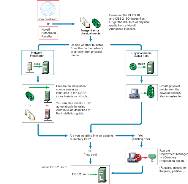 NOTE:Section 4.0, Getting and Preparing OES 2 Software contains instructions for obtaining the ISO image files and the network install script referred to in the following illustration.