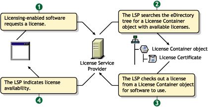 In NetWare, for example, if the license service provider finds a NetWare license unit, it returns a successful status to the library. Otherwise, it returns an error code.