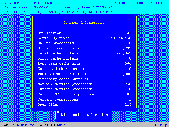Most of the important performance indicators that can be used to track, diagnose, and resolve server problems appear in the General Information screen in Monitor. The following screen is displayed when you load Monitor.