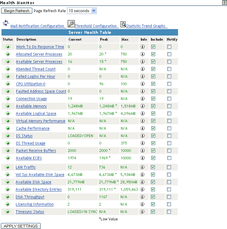 Viewing the Health Monitor page in Novell Remote Manager can give you an immediate view of key indicators for monitoring server memory. You can also set thresholds for the monitoring these items and view trend graphs for these items.