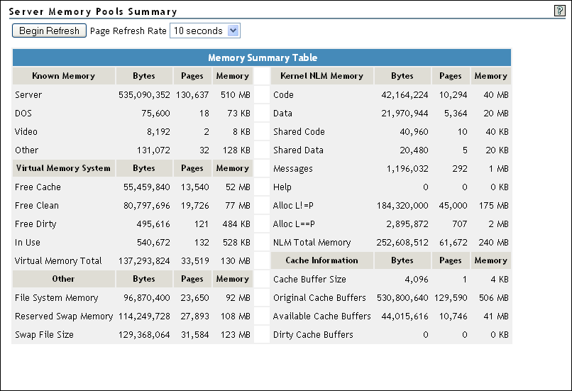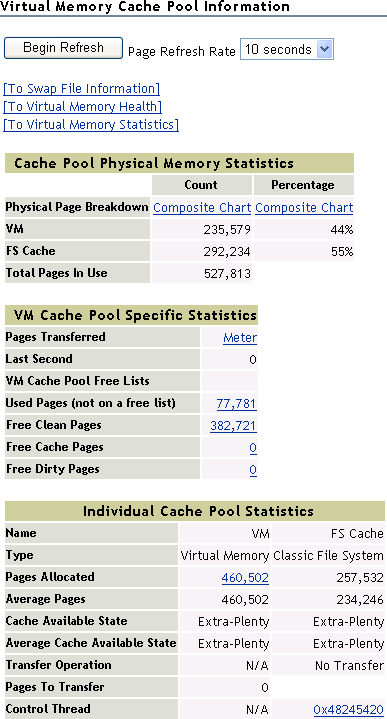 This page shows statistics for the physical memory cache pool, virtual memory cache pool, and individual cache pools. See the online help on this page for details about each of these statistics. This page is more useful for developers who are trying to understand how memory in the system is being used by an NLM program that they are developing.
