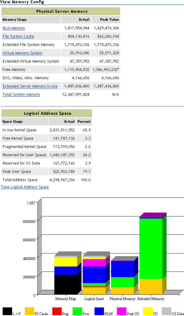 Shows the logical address space information for the NetWare kernel including space in use, available, fragmented, and reserved for User Spaces and OS data. It also shows the peak usage for User Space and the total amount of address space. The User Space reserve is commonly known as Protected Address Space and it always reserves 1 GB of memory whether it is used or not. |