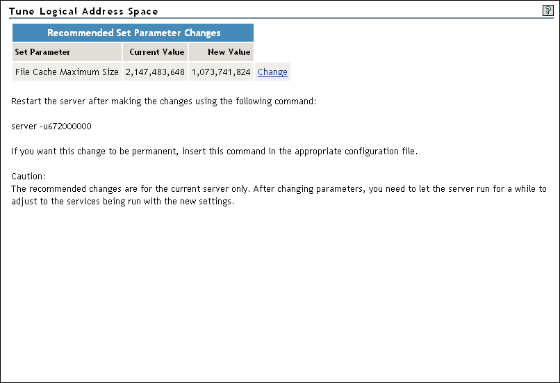 After you have run the server in the current conditions for a week or more, you can use the Tune Logical Address page in Novell Remote Manager to check and optimize logical address space usage and reduce memory fragmentation problems.